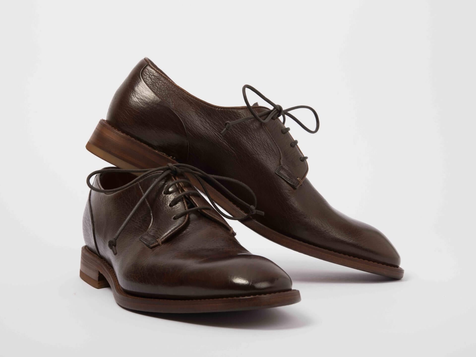 Die Schuhe bestehen zu 100% aus Schweizer Hirschleder, von Tieren, die in der Wildnis gelebt und ebenda auf der Jagd erlegt wurden. Unebenheiten und Kratzer auf dem Leder sind Spuren dieses wilden Lebens und ein Zeichen für Authentizität und Einmaligkeit. Alle Leder werden im Kanton Bern 100% pflanzlich, ohne Chrom und ohne synthetische Gerbmittel gegerbt.